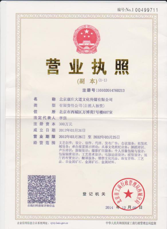 北京康庄大道文化传媒有限公司是集影视创作、制作、发行,企业形象设计、宣传,大型会议、演艺、比赛策划,个人形象策划,艺人经纪,影视车辆服装租赁等专业全面的大型文化传媒公司。拥有国家一级导演为首的专业制作团队,旗下签约众多的国内外演艺精英,演员,模特,歌手。公司参与百部影片的拍摄如:(建国大业)(金陵十三钗)(温故1942)(归来)(芳华)(三八线)金刚川)等。与... 详情……